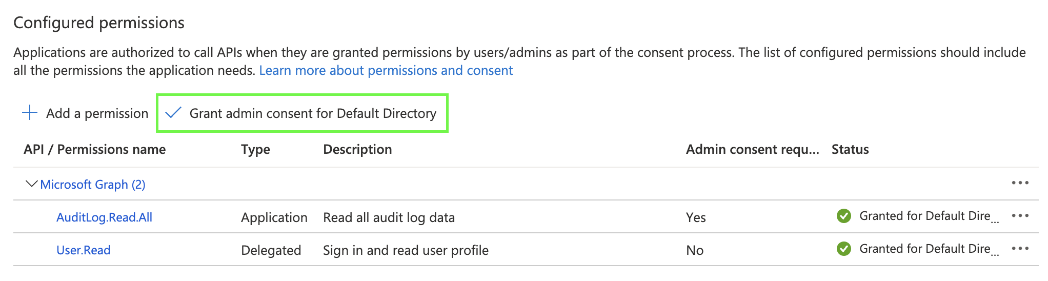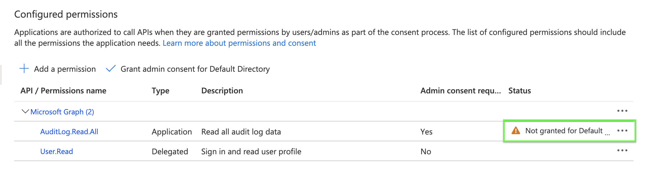 11. Select Grant admin consent for Default Directory (your customer/prospect name may show up vs. Default Directory to grant consent