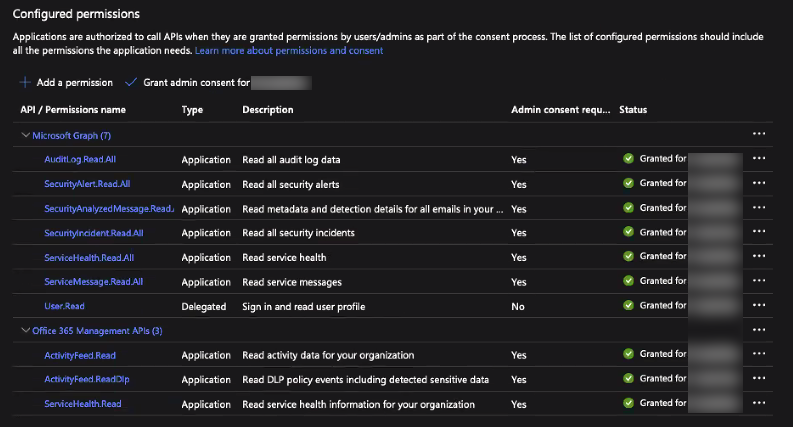 For this walk-through, the permissions set earlier in this doc (here) cover Office 365 Services and Office 365 Activity