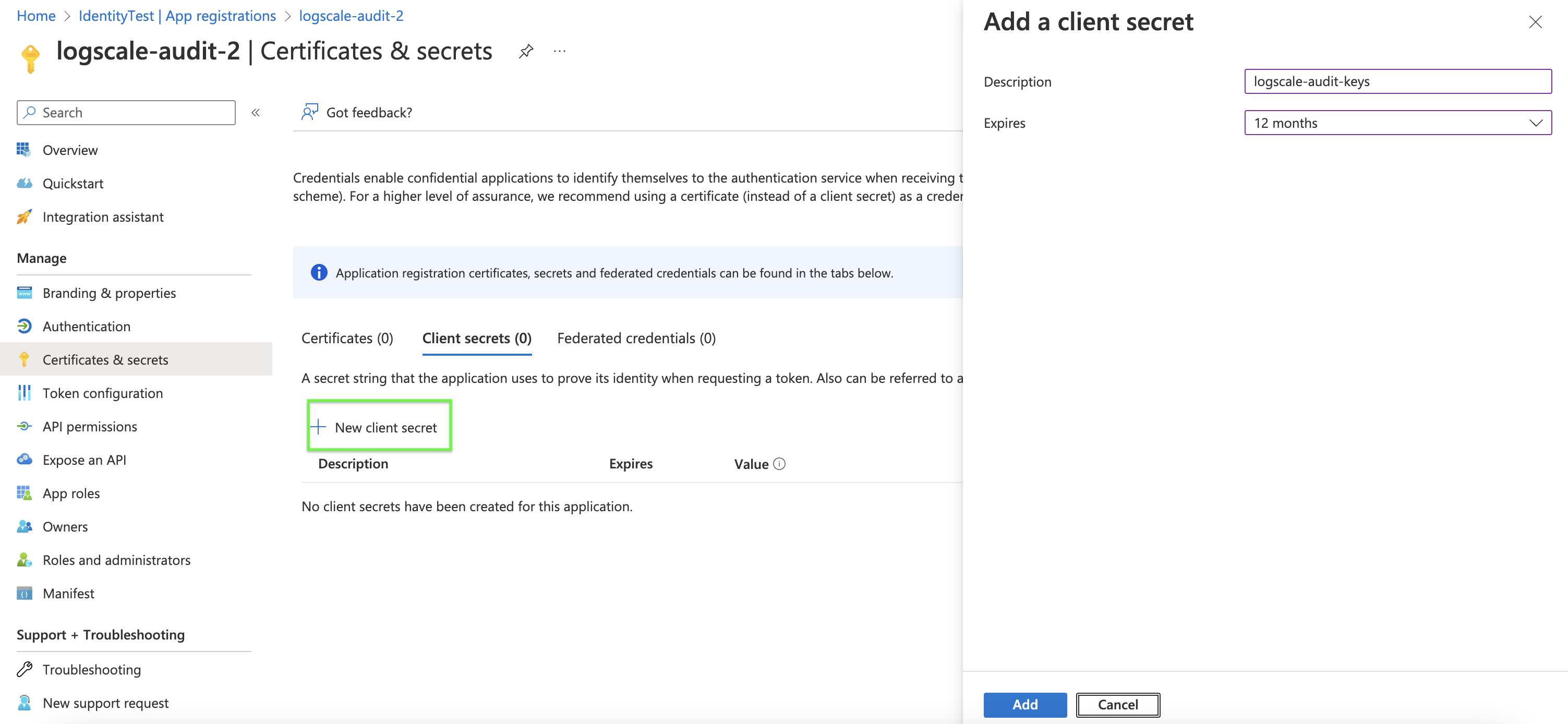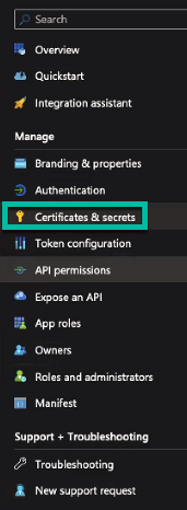 1. Navigate to Certificates & Secrets and create a new client secret