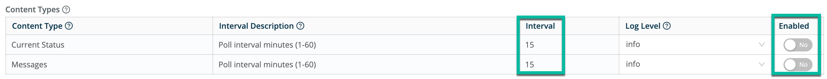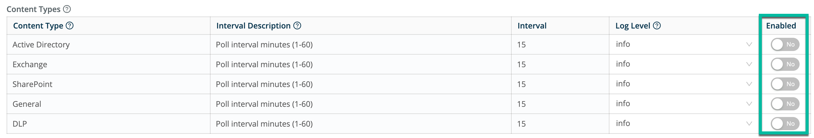 4. In the Content Types section at the bottom of the page, click the Enabled slider depending on the types of data to be collected