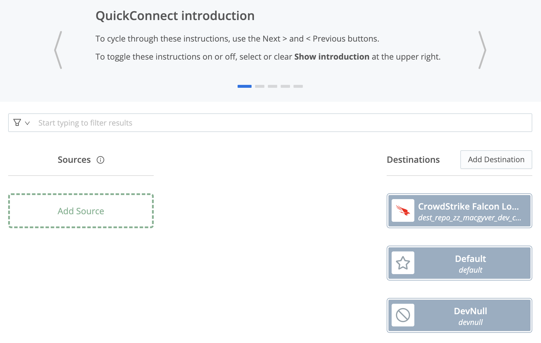 1. Click and hold on the + symbol on the right side of each source, and drag a line over to the CrowdStrike Falcon LogScale entry on the Destination side