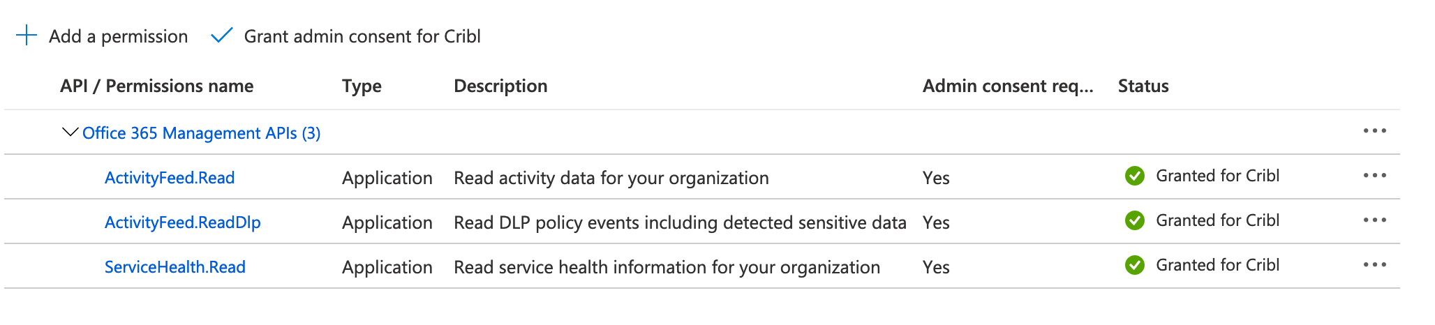In Azure Active Directory, the application representing your Cribl Stream instance must be granted the following permissions to pull data. Each permission's Type must be Application - Delegated is not sufficient: